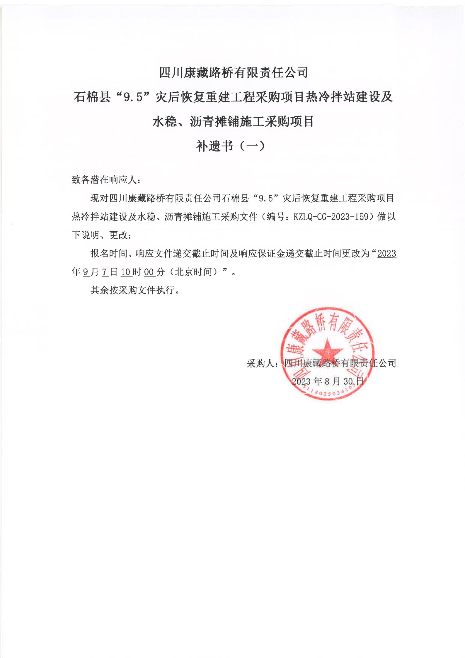 四川康藏路橋有限責(zé)任公司石棉縣“9·5”災(zāi)后恢復(fù)重建工程采購項目熱冷拌站建設(shè)及水穩(wěn)、瀝青攤鋪施工采購項目補(bǔ)遺書(一)