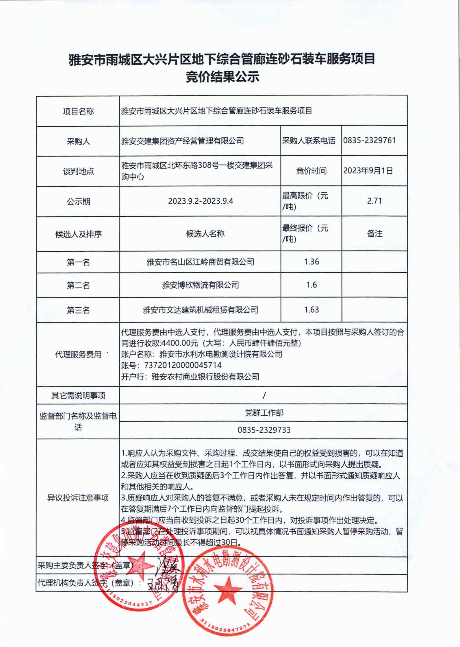 雅安交建集團資產經營管理有限公司大興片區(qū)地下綜合管廊連砂石裝車服務項目競價結果公示
