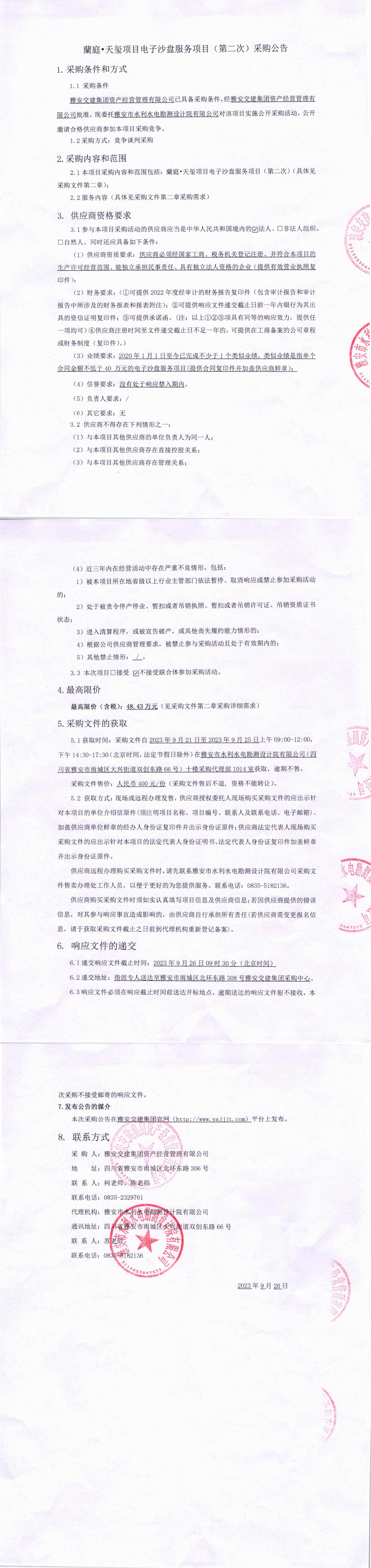 雅安交建集團資產(chǎn)經(jīng)營管理有限公司蘭庭·天璽項目電子沙盤服務項目(第二次)采購公告