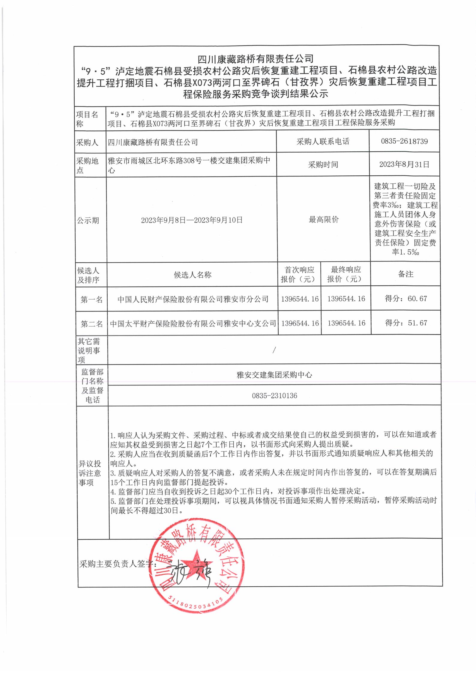 四川康藏路橋有限責(zé)任公司“9·5”瀘定地震石棉縣農(nóng)村公路災(zāi)后恢復(fù)重建工程項(xiàng)目、石棉縣農(nóng)村公路改造提升工程打捆項(xiàng)目、石棉縣X073兩河口至界碑石(甘孜界)災(zāi)后恢復(fù)重建工程項(xiàng)目工程保險(xiǎn)服務(wù)采購(gòu)競(jìng)爭(zhēng)談判結(jié)果公示