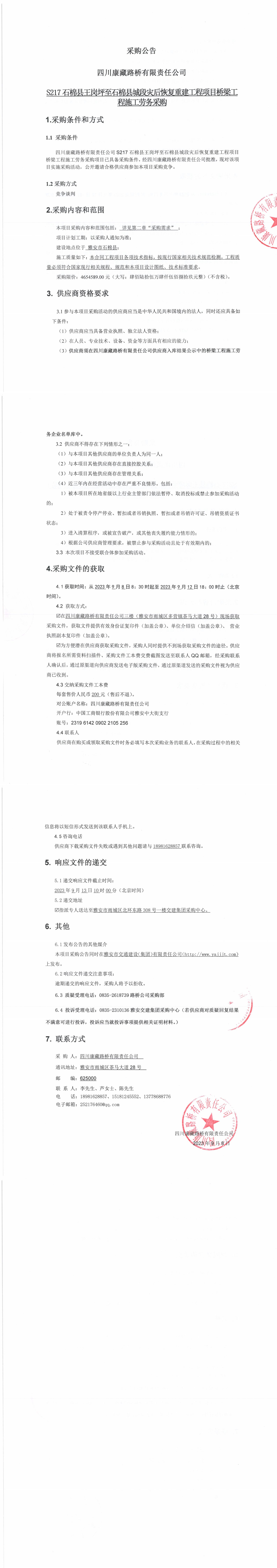 四川康藏路橋有限責(zé)任公司S217石棉縣王崗坪至石棉縣城段災(zāi)后恢復(fù)重建工程項(xiàng)目橋梁工程施工勞務(wù)采購公告