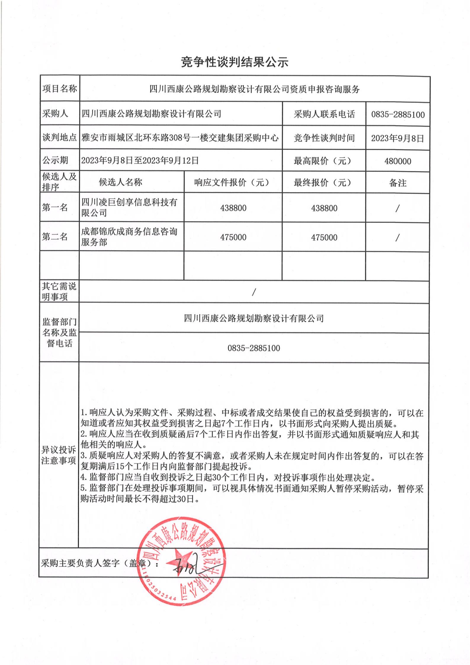 四川西康公路規(guī)劃勘察設(shè)計(jì)有限公司資質(zhì)申報(bào)咨詢服務(wù)競(jìng)爭(zhēng)談判結(jié)果公示
