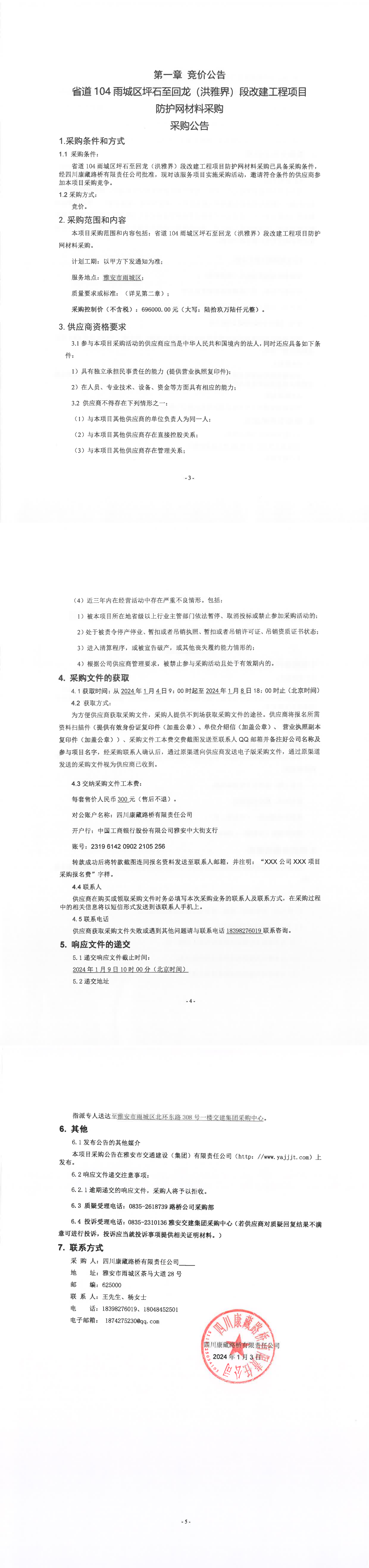 四川康藏路橋有限責(zé)任公司省道104雨城區(qū)坪石至回龍(洪雅界)段改建工程項(xiàng)目防護(hù)網(wǎng)材料采購公告