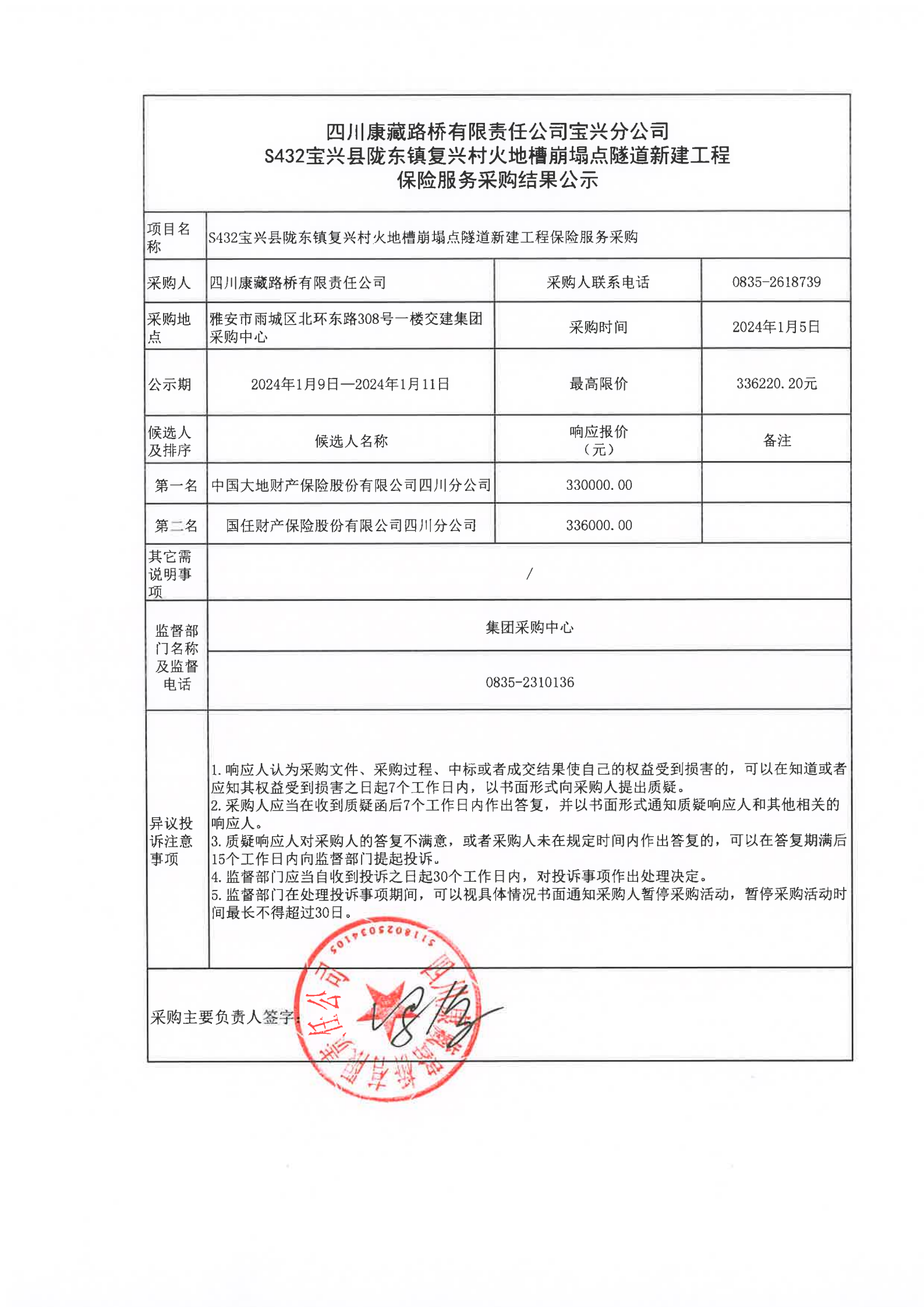 四川康藏路橋有限責任公司S432寶興縣隴東鎮(zhèn)復興村火地槽崩塌點隧道新建工程保險服務采購結果公示