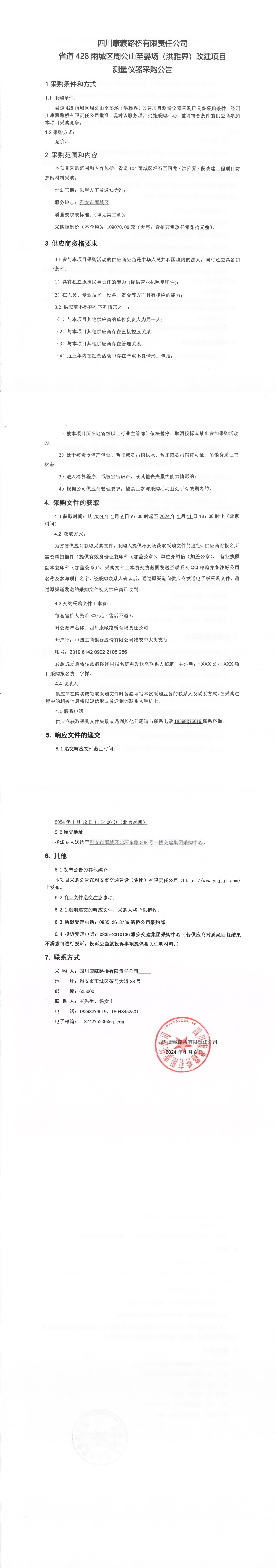 四川康藏路橋有限責(zé)任公司省道428雨城區(qū)周公山至晏場(洪雅界)改建項(xiàng)目測量儀器采購公告