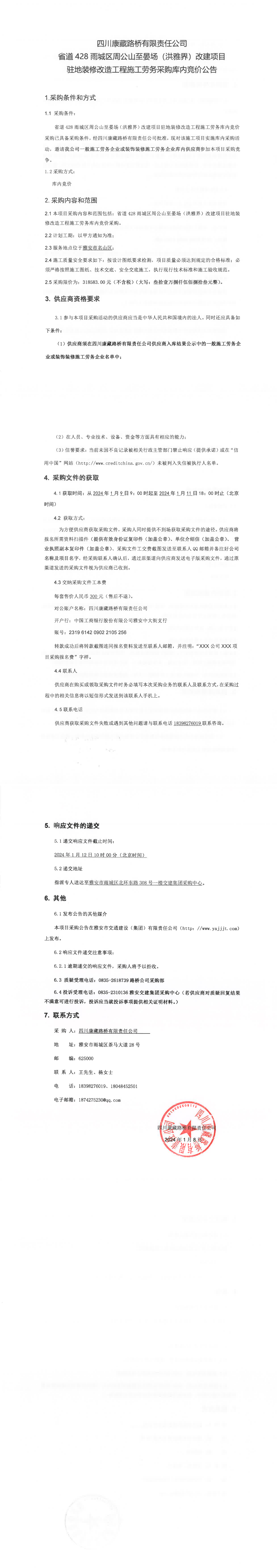 四川康藏路橋有限責任公司省道428雨城區(qū)周公山至晏場(洪雅界)改建項目駐地裝修改造工程施工勞務采購庫內(nèi)競價公告