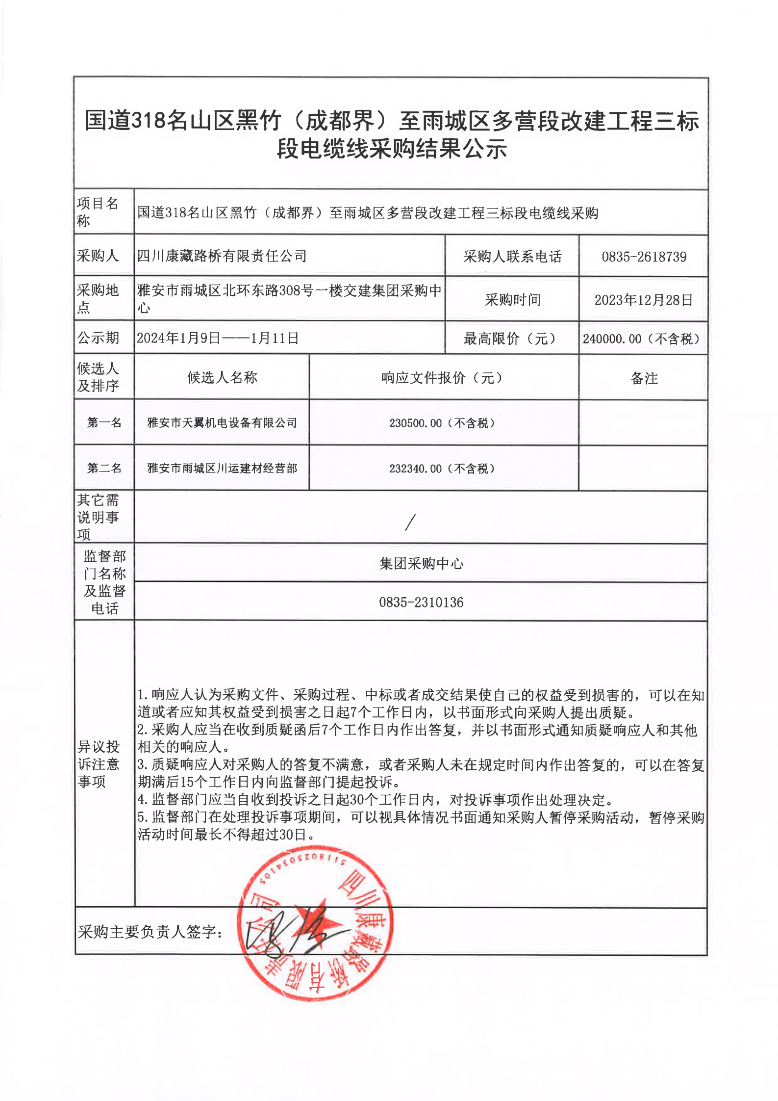 四川康藏路橋有限責(zé)任公司國(guó)道318名山區(qū)黑竹(成都界)至雨城區(qū)多營(yíng)段改建工程三標(biāo)段電纜線采購(gòu)結(jié)果公示