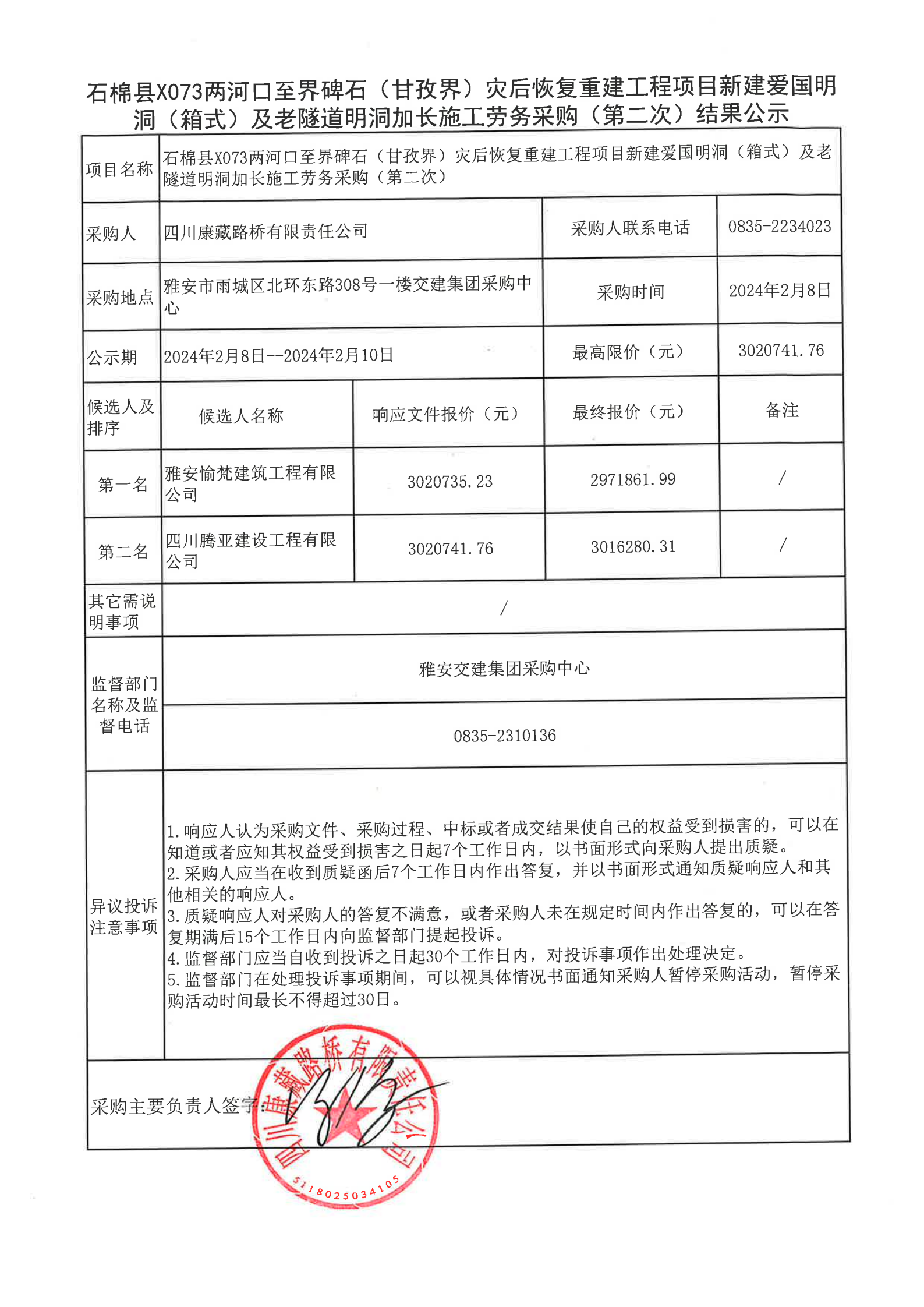 四川康藏路橋有限責(zé)任公司石棉縣X073兩河口至界碑石(甘孜界)災(zāi)后恢復(fù)重建工程項目新建愛國明洞(箱式)及老隧道明洞加長施工勞務(wù)采購(第二次)結(jié)果公示