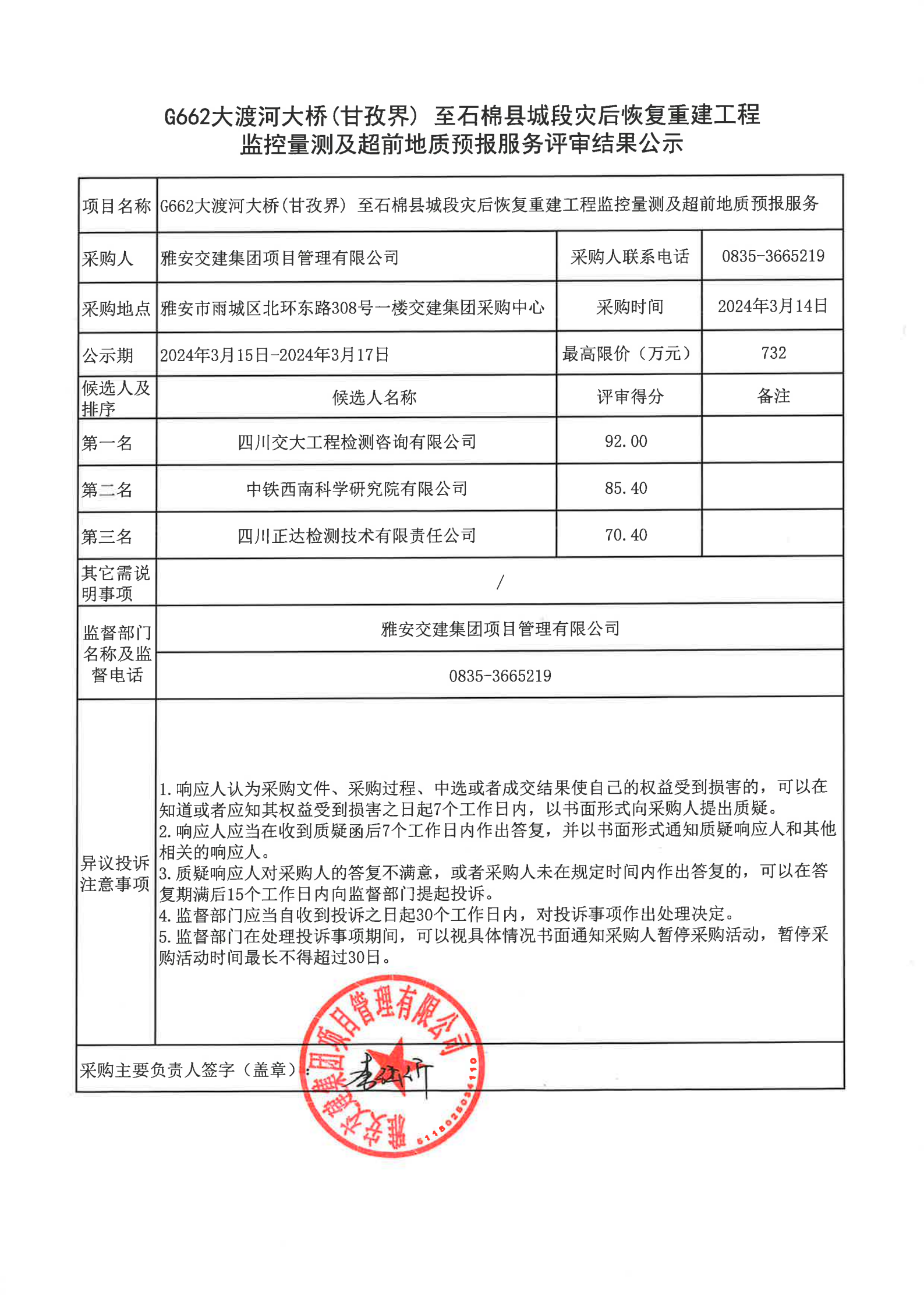 雅安交建集團(tuán)項目管理有限公司G662大渡河大橋(甘孜界)至石棉縣城段災(zāi)后恢復(fù)重建工程監(jiān)控量測及超前地質(zhì)預(yù)報服務(wù)評審結(jié)果公示
