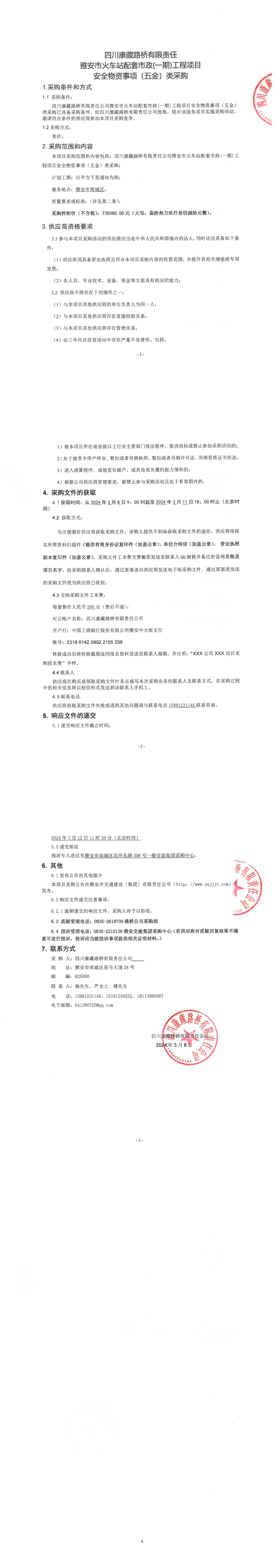 四川康藏路橋有限責任公司雅安市火車站配套市政(一期)工程項目安全物資事項(五金)類采購公告