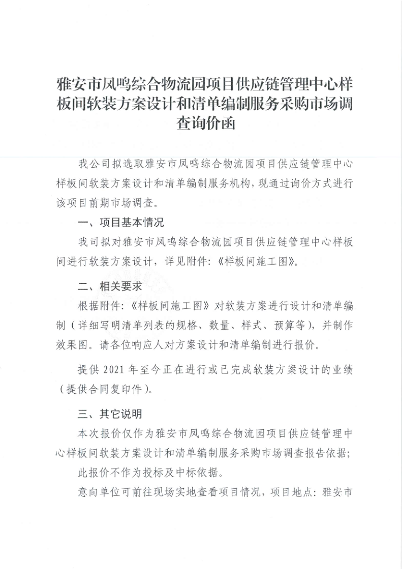 雅安交建集團(tuán)物流發(fā)展有限公司雅安市鳳鳴綜合物流園項(xiàng)目供應(yīng)鏈管理中心樣板間軟裝方案設(shè)計(jì)和清單編制服務(wù)采購(gòu)市場(chǎng)調(diào)查詢價(jià)函