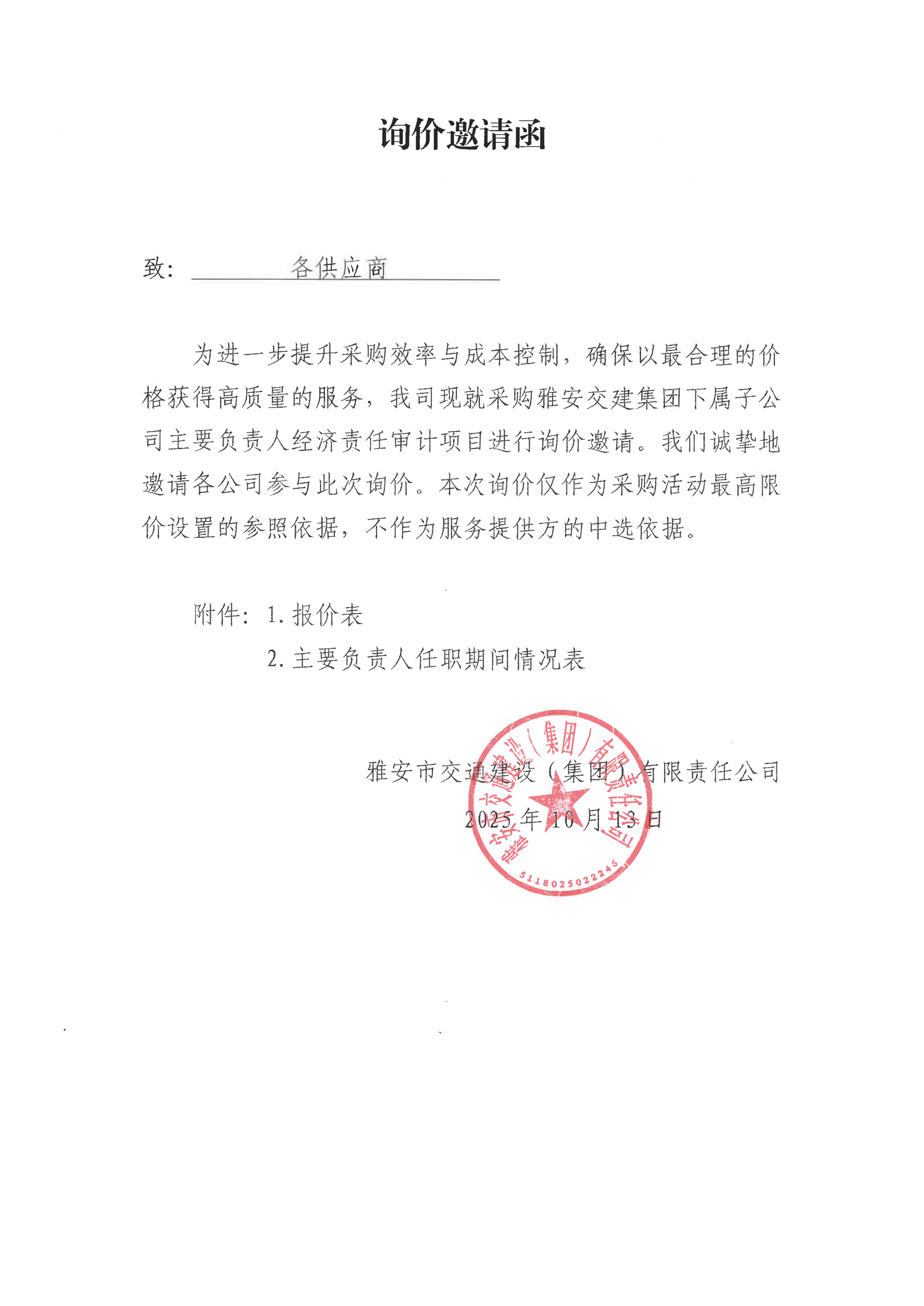 關(guān)于雅安交建集團(tuán)下屬子公司主要負(fù)責(zé)人經(jīng)濟(jì)責(zé)任審計(jì)項(xiàng)目限價(jià)的詢價(jià)函