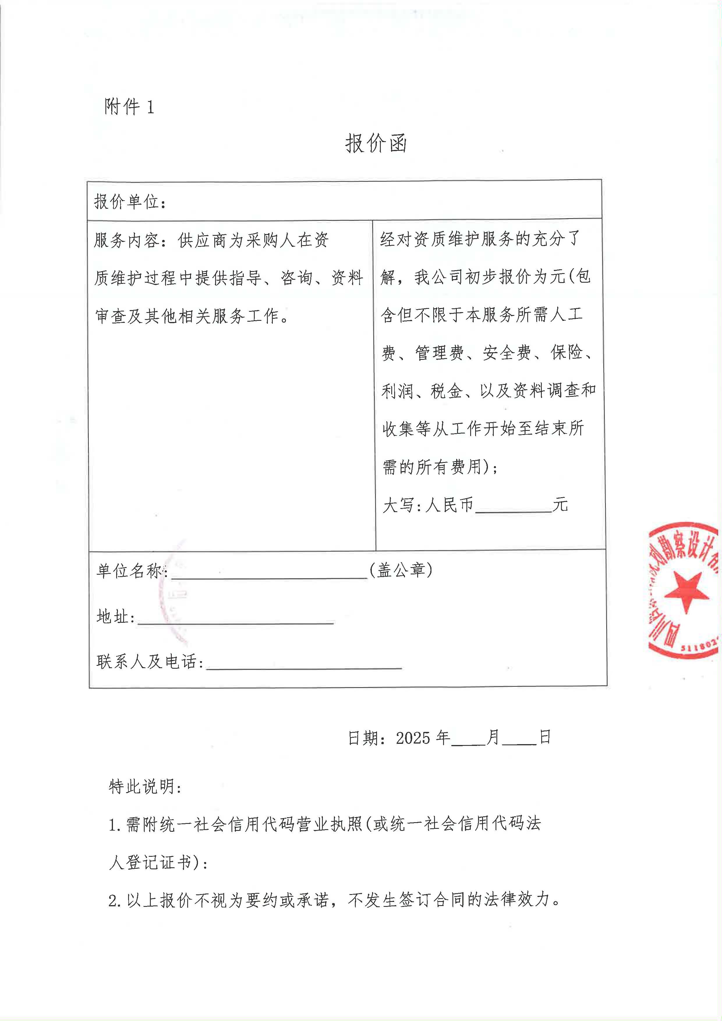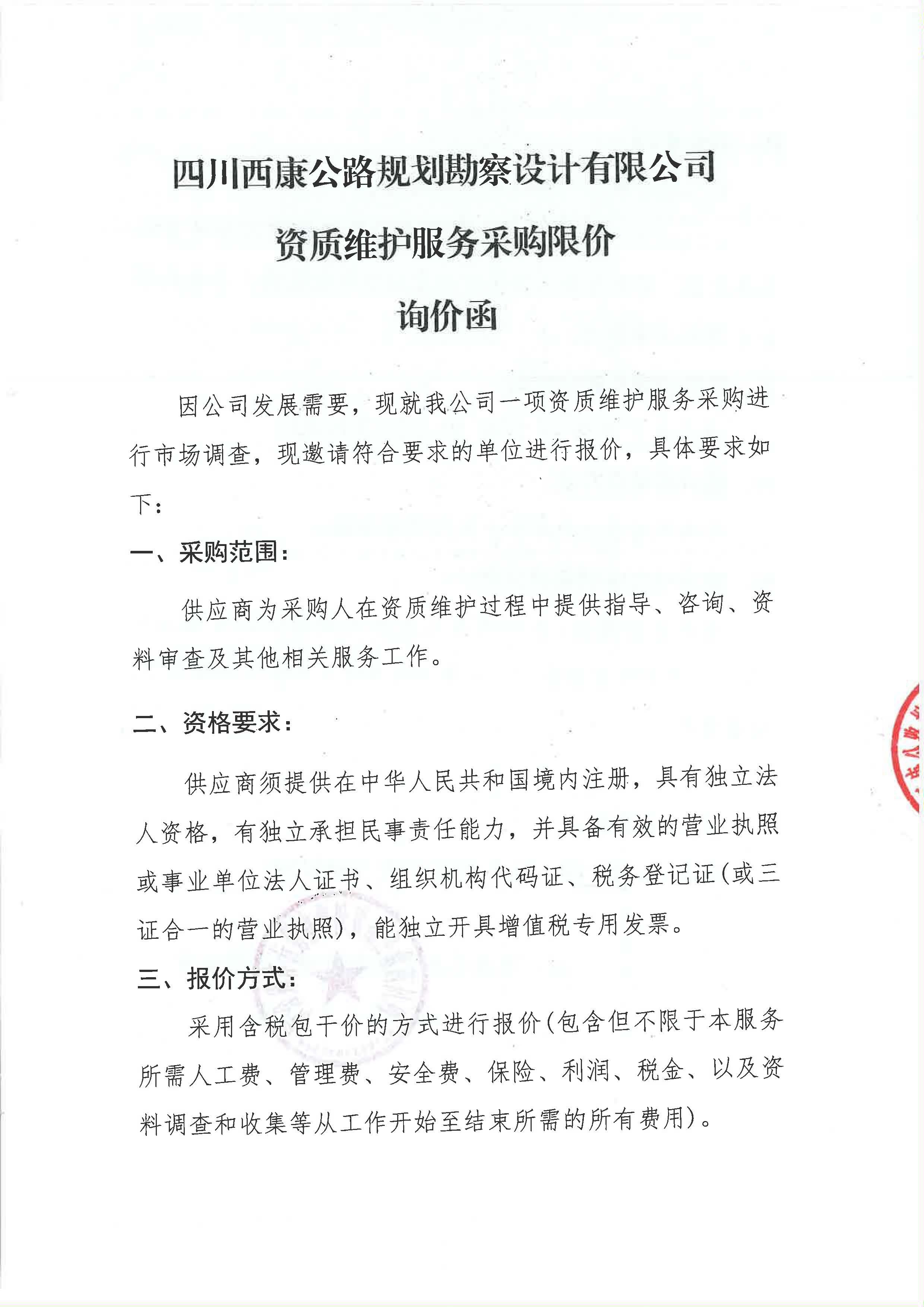 四川西康公路規(guī)劃勘察設(shè)計有限公司資質(zhì)維護(hù)服務(wù)采購限價詢價函