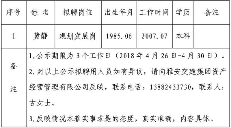 通過公開報名、資格審查、面試等程序,經雅安交建集團資產經營管理有限公司研究擇優(yōu)確定以下1名擬聘用人員,現(xiàn)公示名單如下: