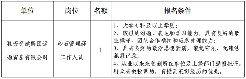 根據(jù)發(fā)展需要,決定面向社會(huì)公開招聘雅安市交通建設(shè)(集團(tuán))有限責(zé)任公司(以下簡稱“雅安交建集團(tuán)”)所屬子公司工作人員1名,現(xiàn)將有關(guān)事項(xiàng)公告如下: