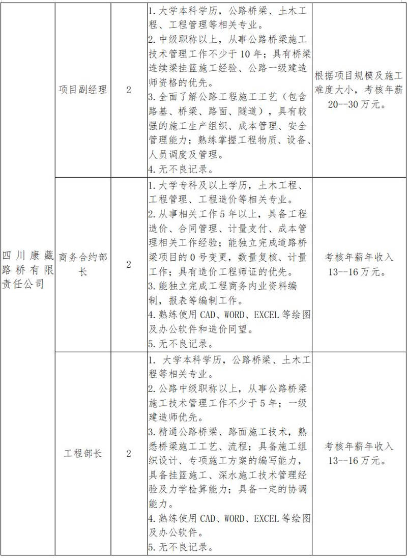 根據(jù)發(fā)展需要,決定面向社會公開招聘雅安市交通建設(shè)(集團)有限責(zé)任公司(以下簡稱“雅安交建集團”)所屬子公司工程項目主要負責(zé)人10名,現(xiàn)將有關(guān)事項公告如下: