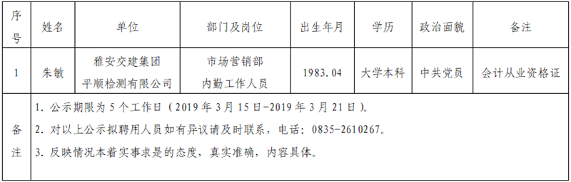 雅安交建集團(tuán)子公司擬聘用人員公示(平順公司)