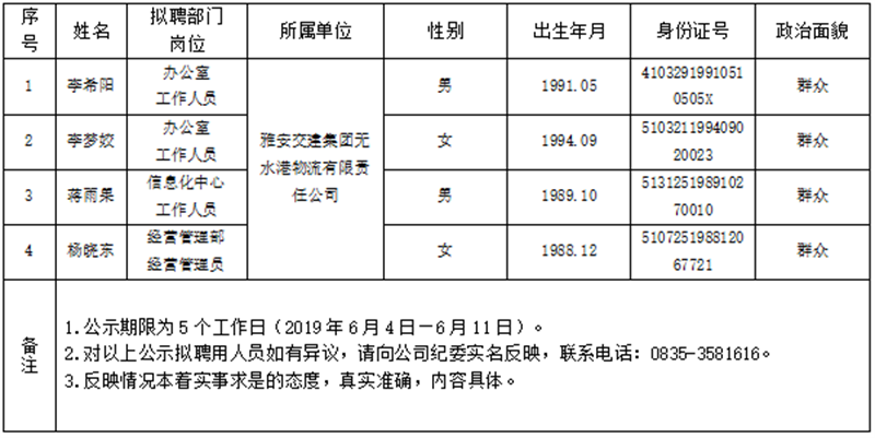 雅安交建集團(tuán)所屬子公司擬聘用人員公示(無(wú)水港公司)