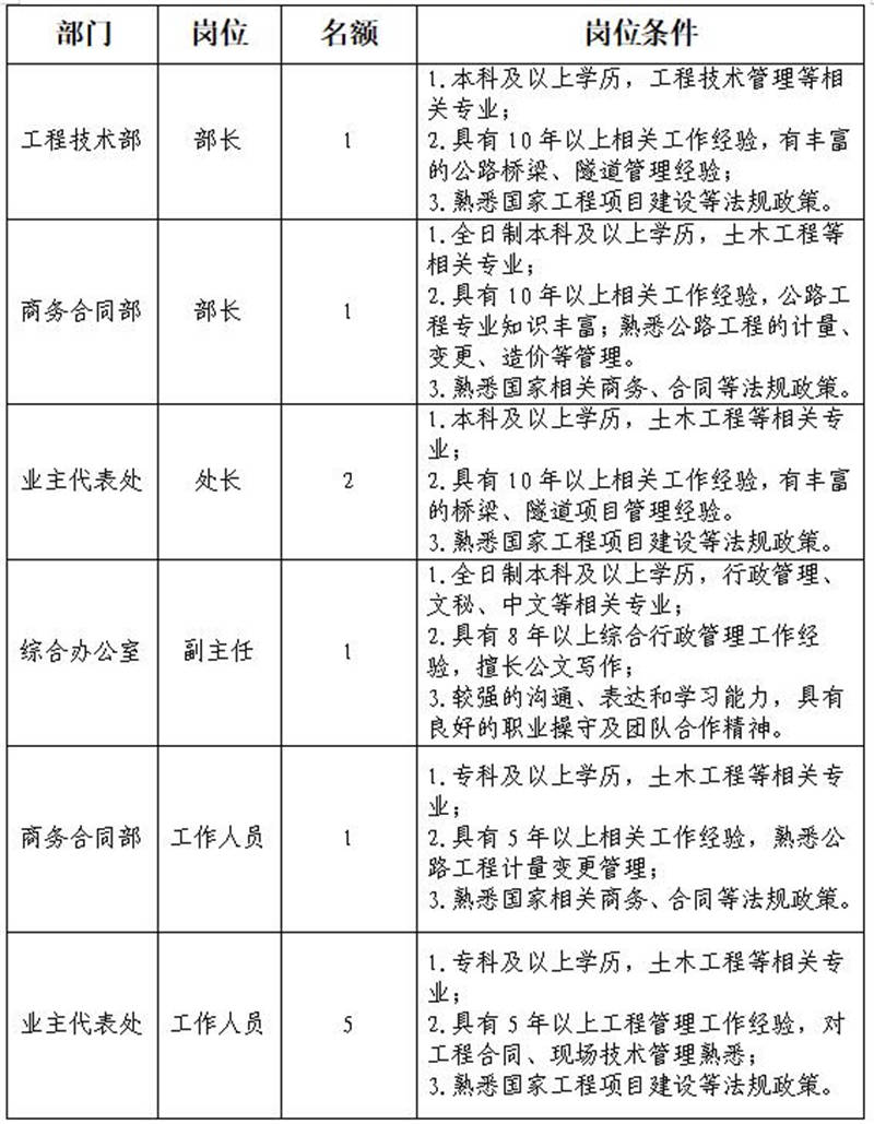 根據(jù)發(fā)展需要,決定面向社會(huì)公開(kāi)招聘雅安市交通建設(shè)(集團(tuán))有限責(zé)任公司(以下簡(jiǎn)稱“雅安交建集團(tuán)”)所屬子公司管理人員及工作人員共計(jì)11名,現(xiàn)將有關(guān)事項(xiàng)公告如下: