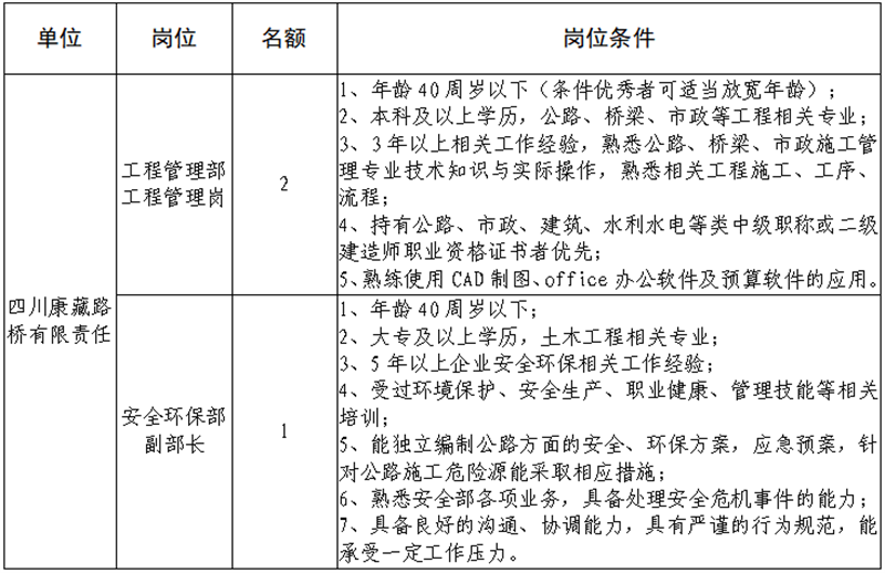 雅安交建集團(tuán)關(guān)于公開招聘所屬子公司工作人員的公告(路橋公司)