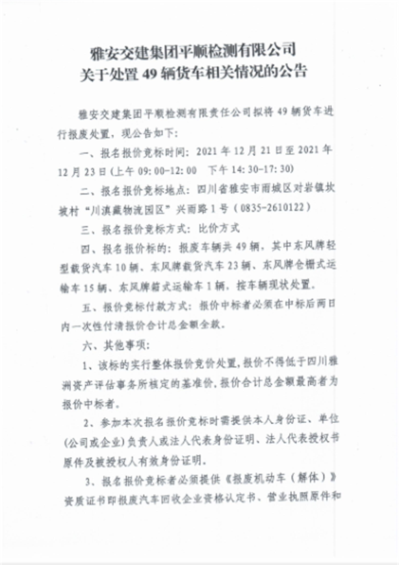 雅安交建集團平順檢測有限公司 關于處置49輛貨車相關情況的公告