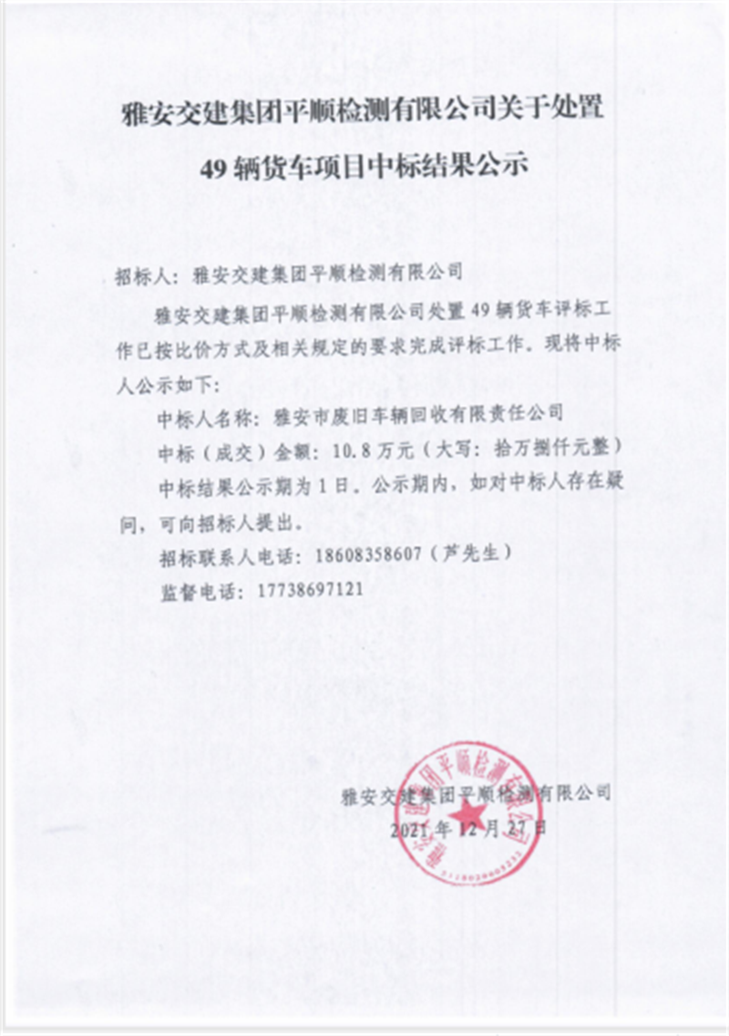 雅安交建集團(tuán)平順檢測(cè)公司關(guān)于處置49輛貨車(chē)項(xiàng)目中標(biāo)結(jié)果公示