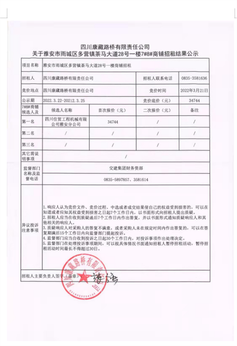 四川康藏路橋有限責(zé)任公司關(guān)于雅安市雨城區(qū)多營(yíng)鎮(zhèn)茶馬大道28號(hào)一樓7#8#商鋪招租結(jié)果公示