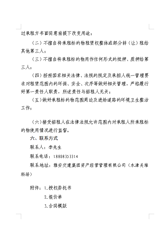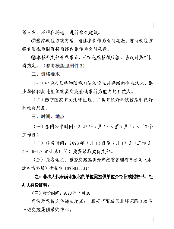 雅安交建集團(tuán)資產(chǎn)經(jīng)營(yíng)管理有限公司 雅安市雨城區(qū)大興鎮(zhèn)水津關(guān)堆料場(chǎng)龍溪村四組和八組部分閑置臨時(shí)用地招租公告附件