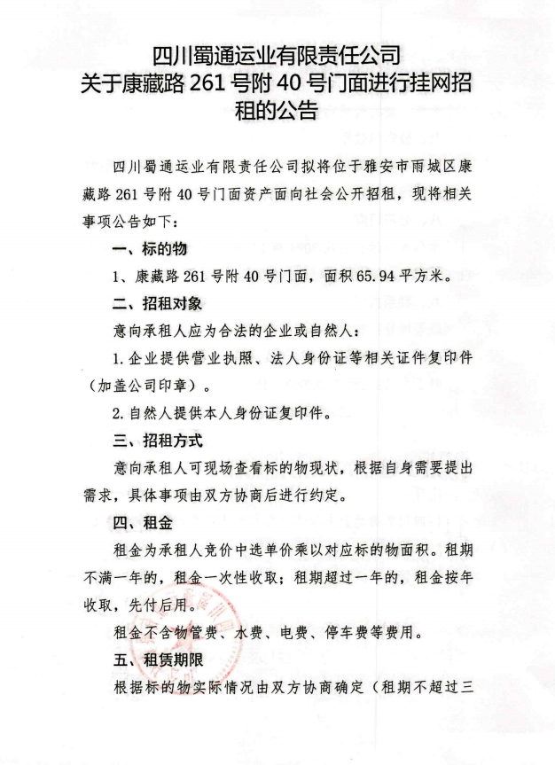 四川蜀通運業(yè)有限責任公司 關于康藏路261號附40號門面進行掛網(wǎng)招租的公告