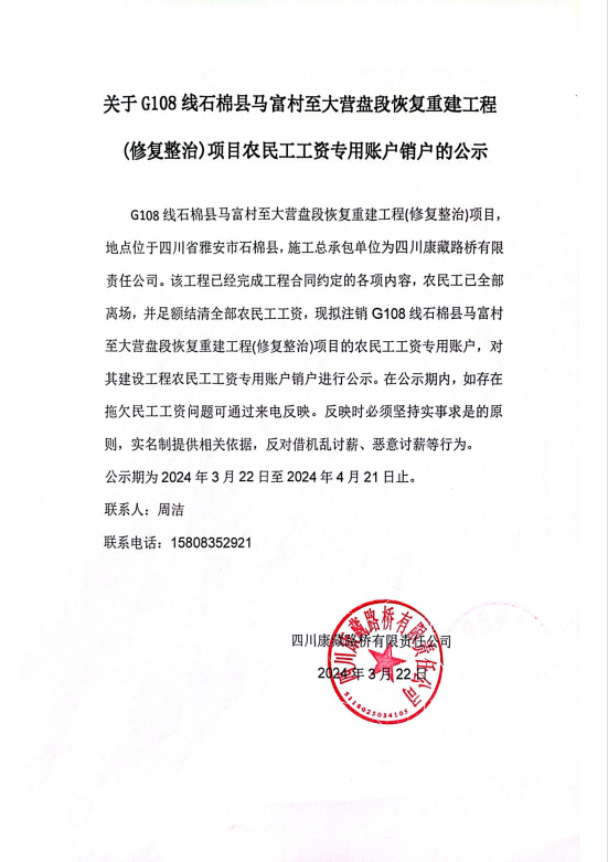 關(guān)于G108線石棉縣馬富村至大營盤段恢復(fù)重建工程(修復(fù)整治)項(xiàng)目農(nóng)民工工資專用賬戶銷戶的公示