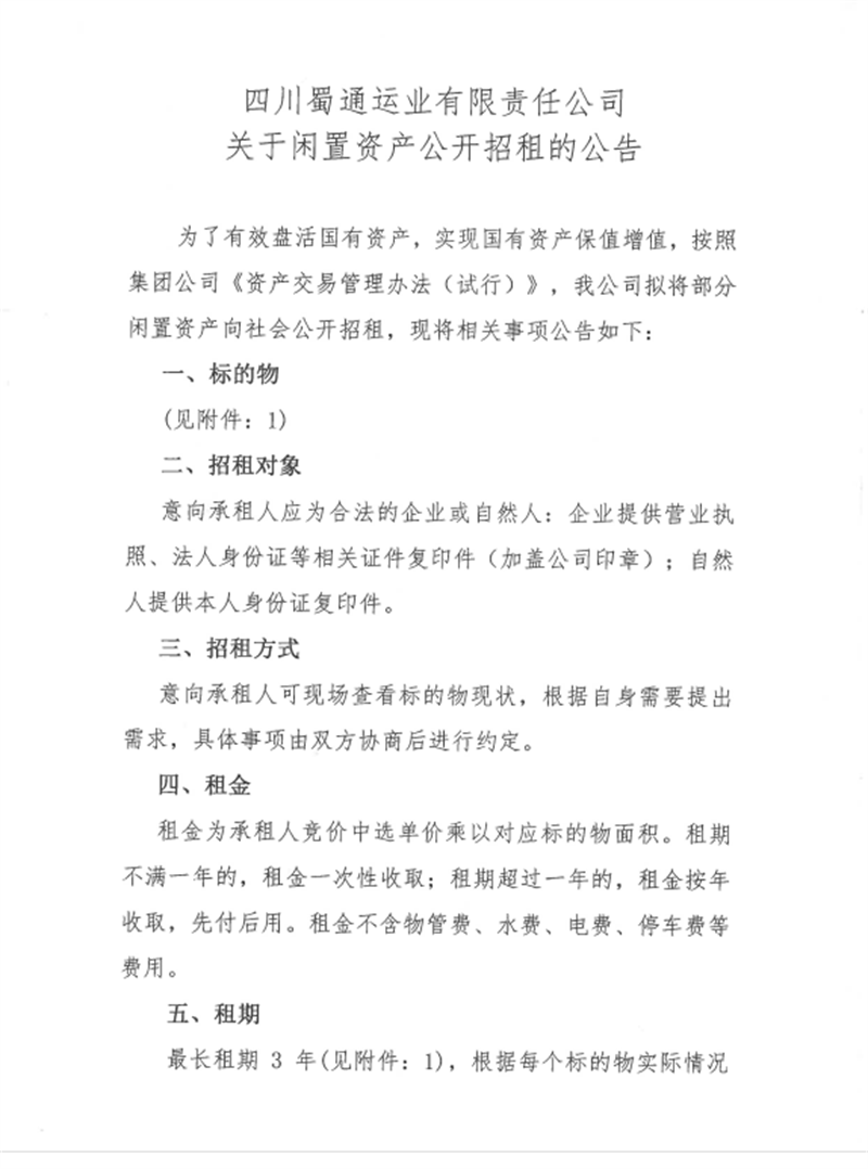 蜀通運業(yè)有限責任公司關于閑置資產(chǎn)公開招租的公告