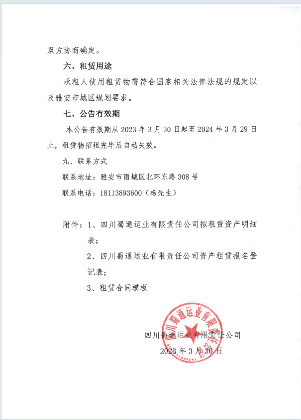 蜀通運業(yè)有限責任公司關(guān)于閑置資產(chǎn)公開招租的公告附件