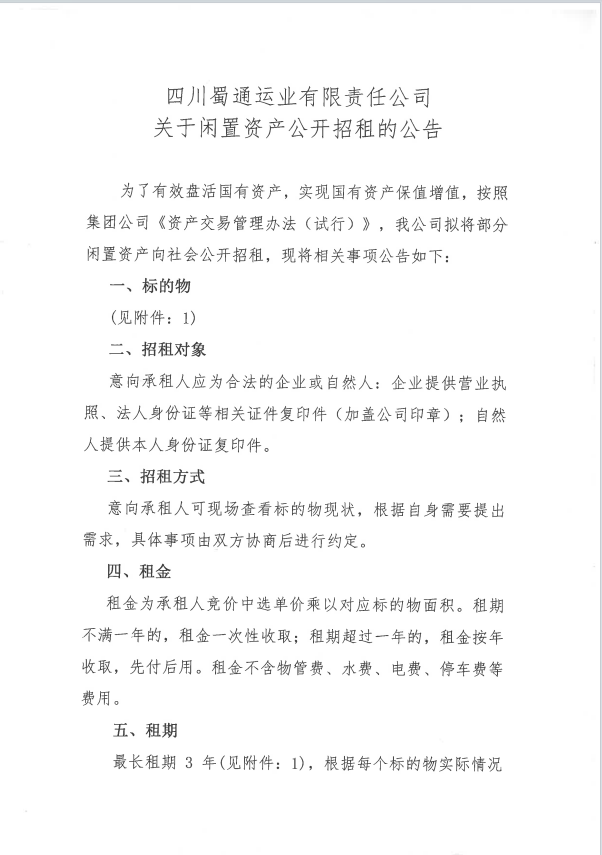 蜀通運業(yè)有限責任公司關(guān)于閑置資產(chǎn)公開招租的公告