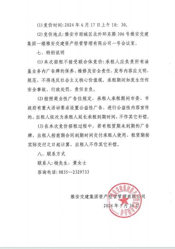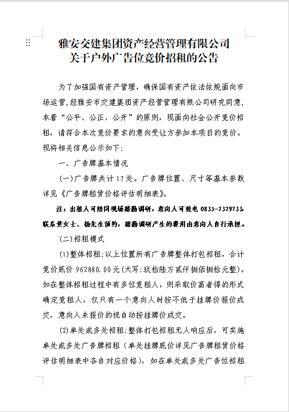 雅安交建集團資產經營管理有限公司關于戶外廣告位競價招租的公告