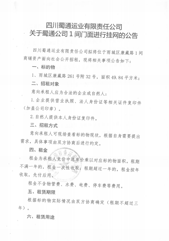 四川蜀通運業(yè)有限責任公司關(guān)于蜀通公司1間門面進行掛網(wǎng)的公告