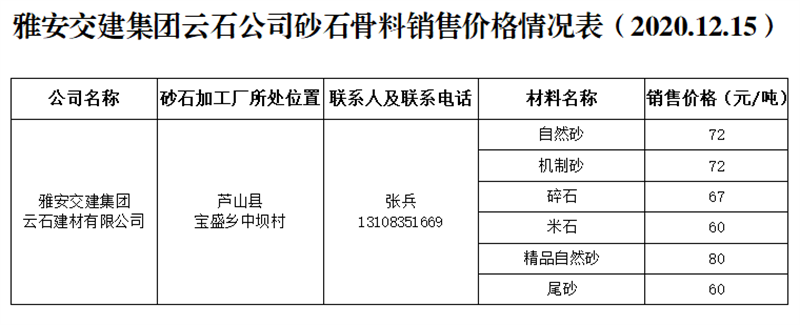 ÑŰ²½»½¨¼¯ˆF(tu¨¢n)ÔÆÊ¯¹«Ë¾É°Ê¯¹ÇÁÏäN(xi¨¡o)ÊÛƒr(ji¨¤)¸ñÇé›r±í£¨2020.12.15£©