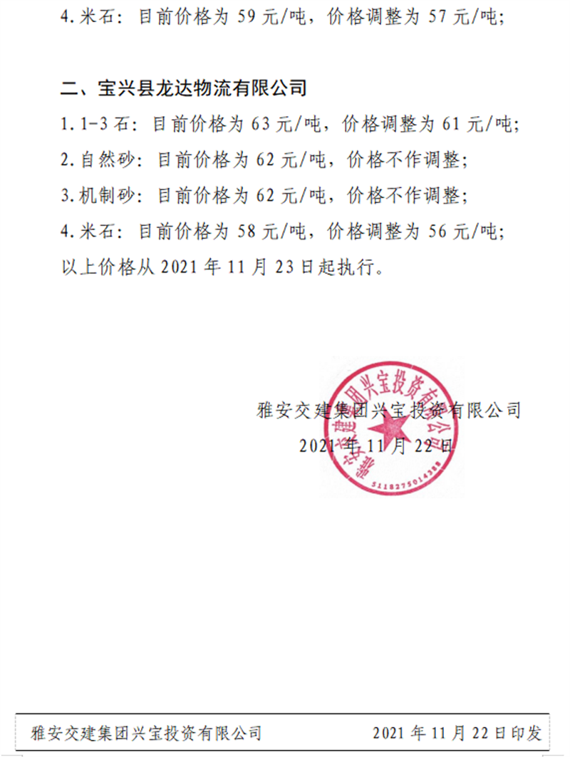 雅安交建集團(tuán)興寶公司關(guān)于調(diào)整成品料銷(xiāo)售價(jià)格的通知(2021.11.26)