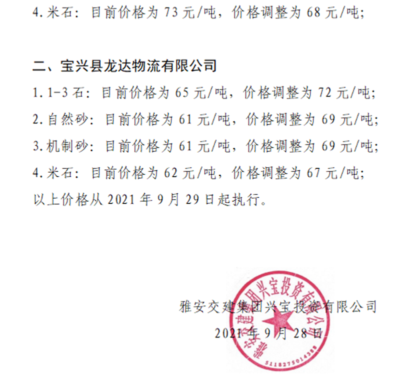 雅安交建集團(tuán)興寶公司關(guān)于調(diào)整砂石成品料銷(xiāo)售價(jià)格的通知(2021.9.28)