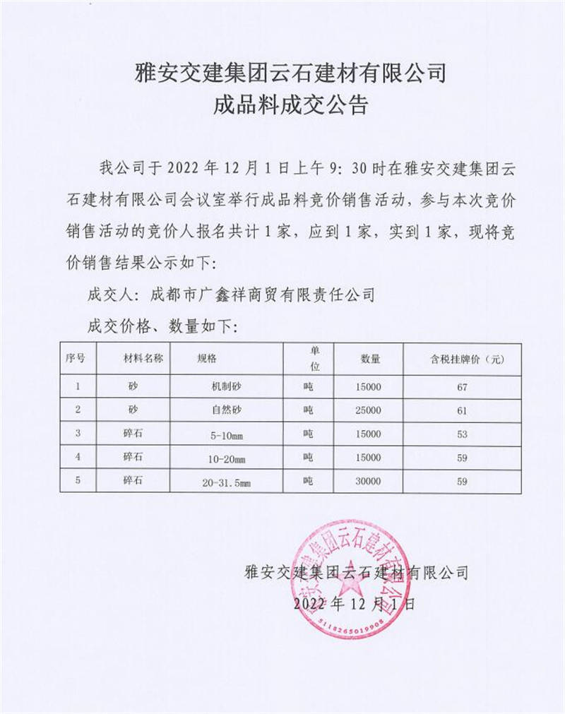雅安交建集團(tuán)云石建材有限公司成品料競價銷售成交公告(2022-12-01)