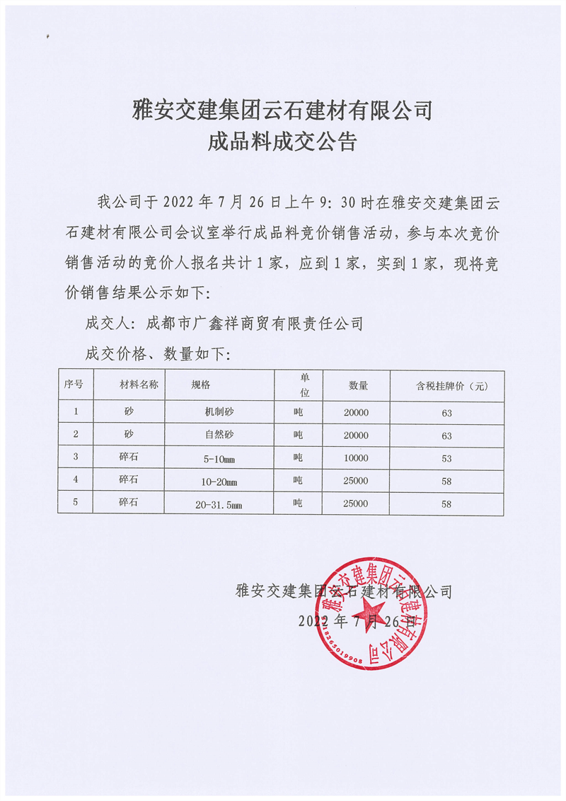 雅安交建集團(tuán)云石建材有限公司成品料競(jìng)價(jià)銷(xiāo)售成交公告7.26