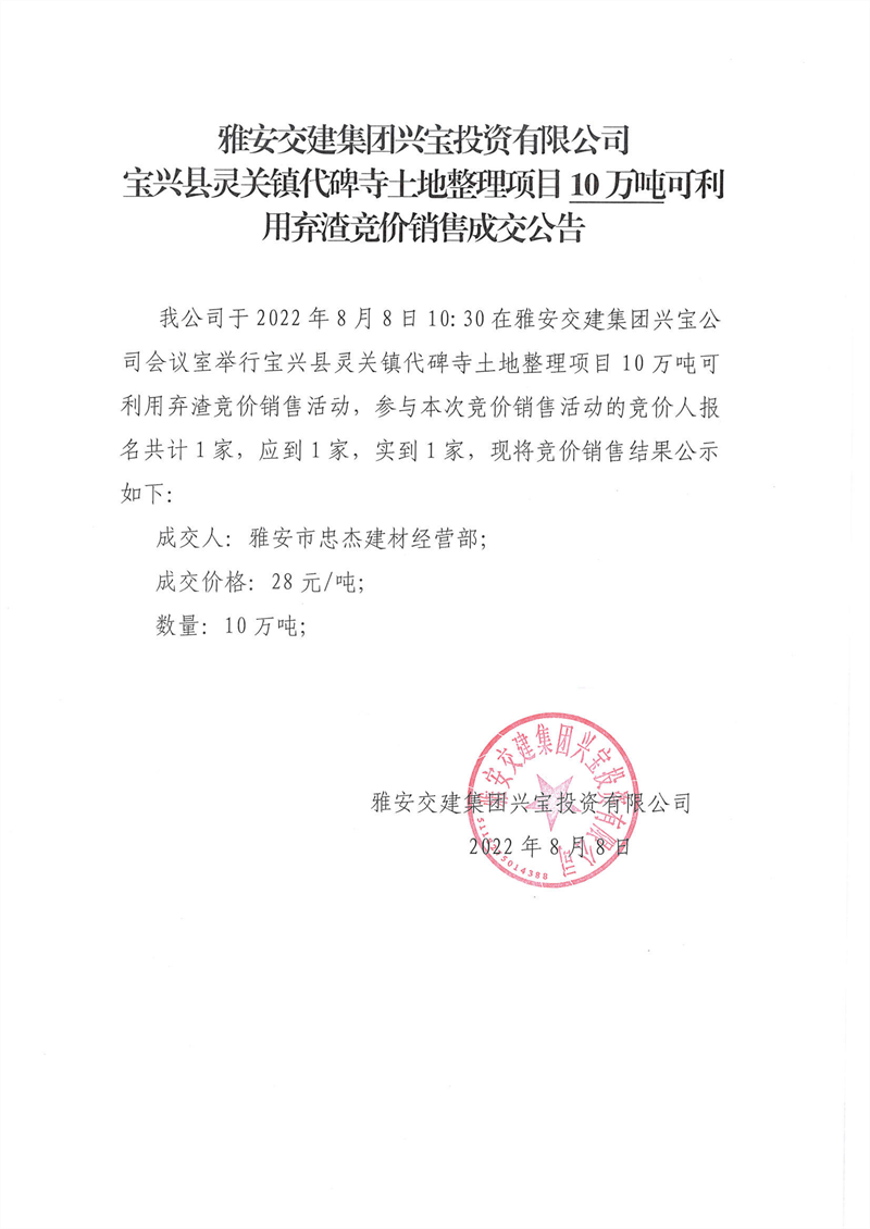 代碑寺土地整理項目10萬噸可利用棄渣競價銷售成交公告