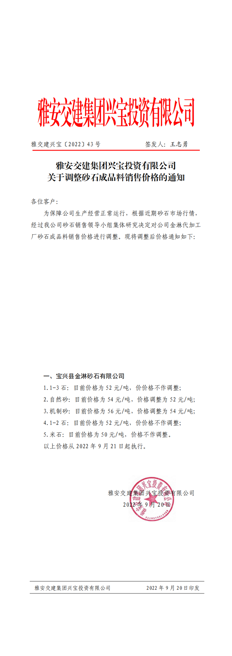 雅交建興寶〔2022〕43號 關(guān)于調(diào)整砂石成品料銷售價格的通知