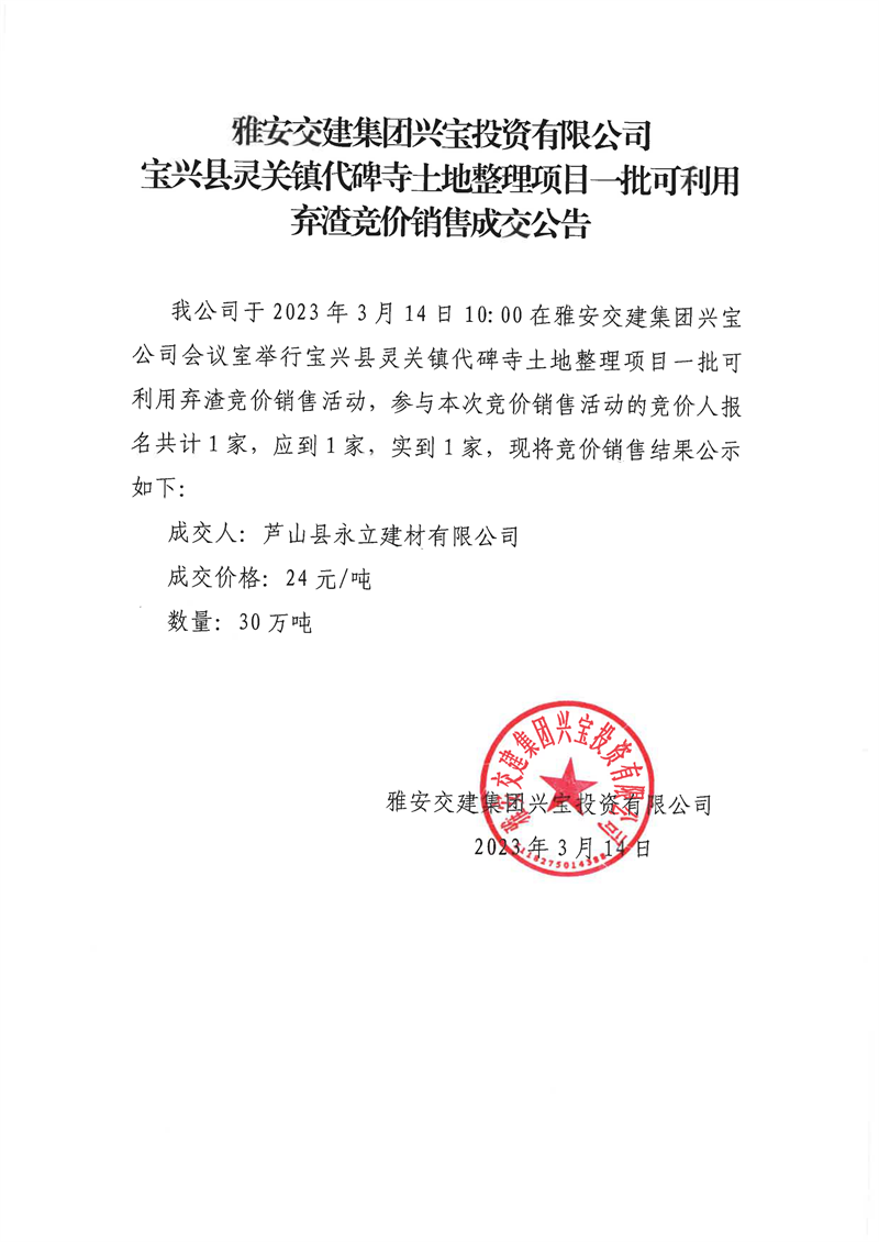 雅安交建集團(tuán)興寶投資有限公司靈關(guān)鎮(zhèn)代碑寺土地整理項目30萬噸可利用棄渣競價銷售成交公告(2023.3.20)