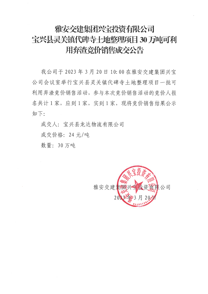 雅安交建集團(tuán)興寶投資有限公司靈關(guān)鎮(zhèn)代碑寺土地整理項目30萬噸可利用棄渣競價銷售成交公告(2023.3.20)