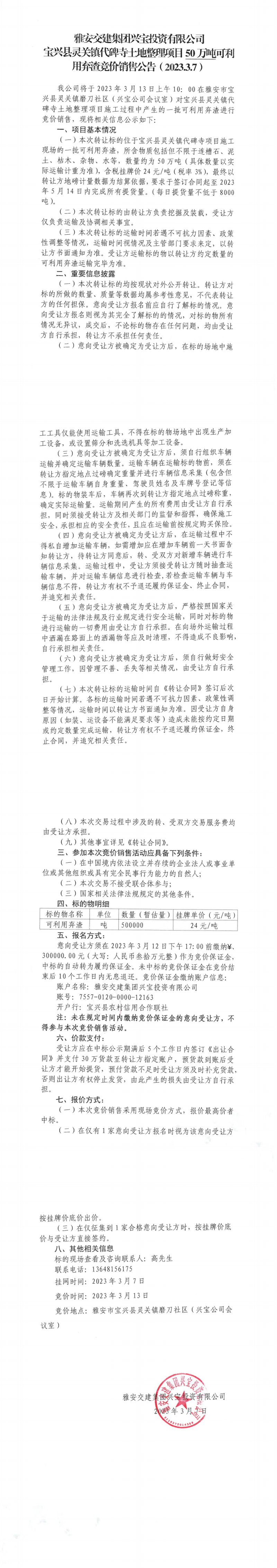 雅安交建集團(tuán)興寶投資有限公司靈關(guān)鎮(zhèn)代碑寺土地整理項(xiàng)目50萬(wàn)噸可利用棄渣競(jìng)價(jià)銷售公告(2023.3.7)