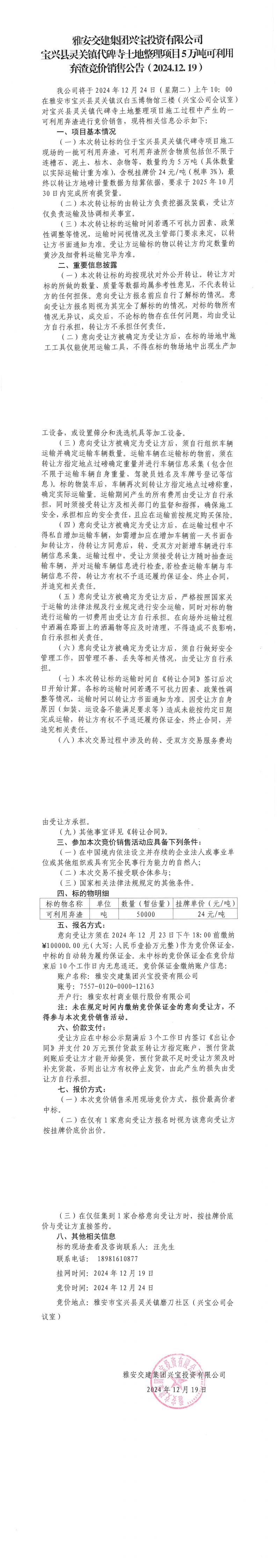 雅安交建集團興寶投資有限公司靈關鎮(zhèn)代碑寺土地整理項目5萬噸可利用棄渣競價銷售公告(2024.12.19)