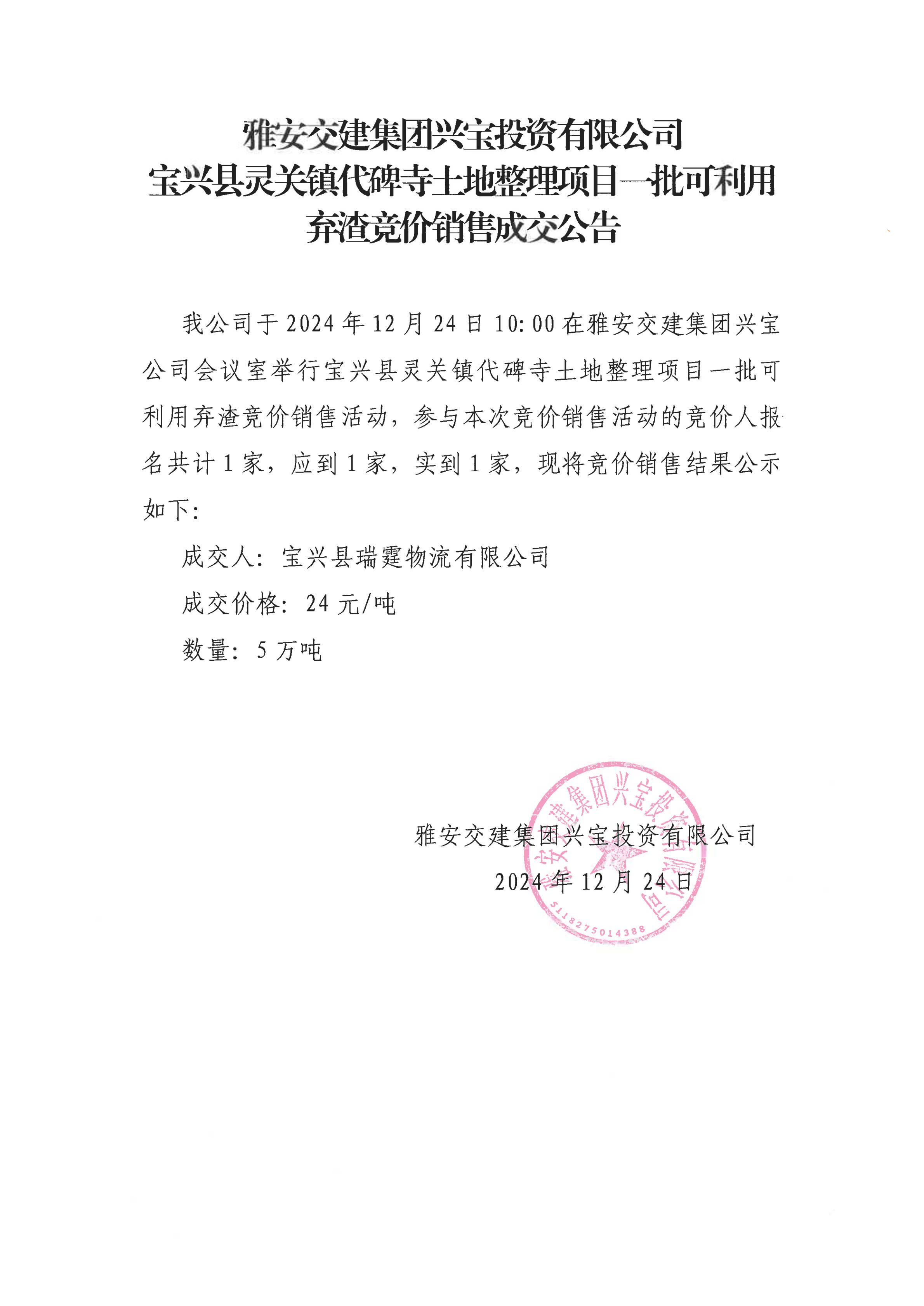 雅安交建集團興寶投資有限公司靈關鎮(zhèn)代碑寺土地整理項目5萬噸可利用棄渣成交公告(2024.12.24)
